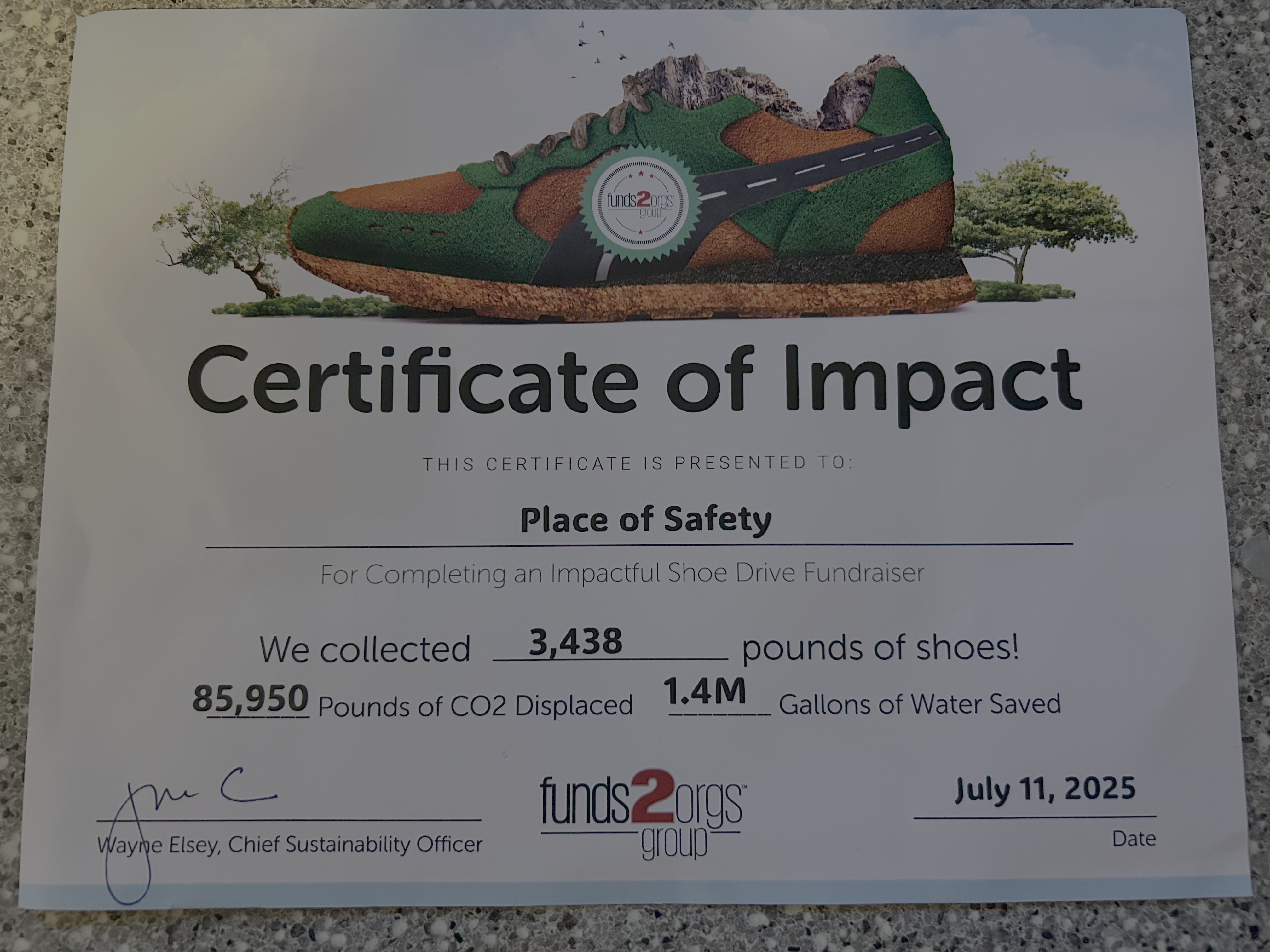 Approximately 630 million pairs of shoes are thrown away each year that end up in landfills. These shoes contribute to a long-term methane gas problem as they compost. Instead of throwing these shoes away, they can contribute to the uplifting of people all around the world through âA Place of Safety.â